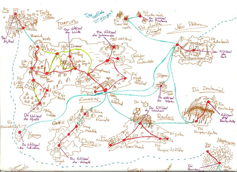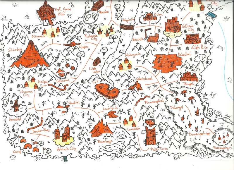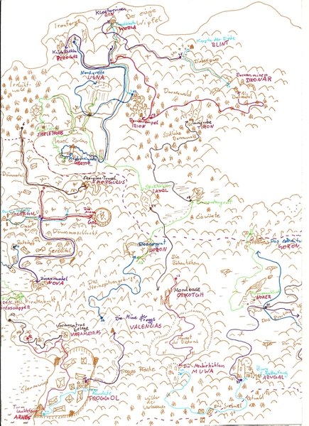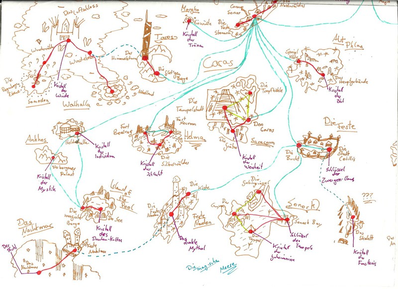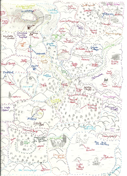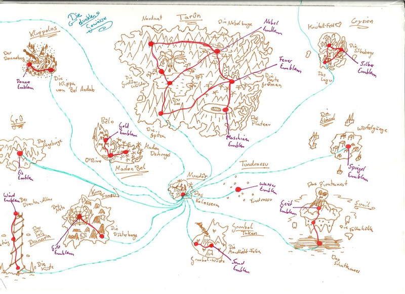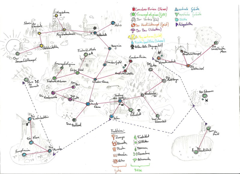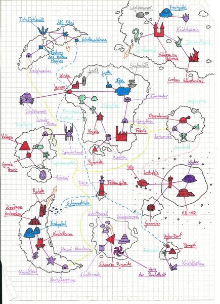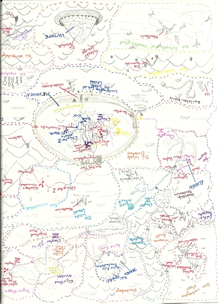 Hier habe ich einmal einige meiner Karten und Pläne bezüglich des Leveldesigns gesammelt. Es handelt sich hierbei um Konzepte sowohl für PC- als auch Brettspiele. Anhand dieser Karten entwerfe ich dann meist Kreaturen und Gebäude, die auf den jeweiligen Bereich abgestimmt sind. Aus vielen dieser Karten habe ich Orte übernommen und in "Equilibrium" verarbeitet, daher könnte man dies auch unweigerlich als "Ideensammlung" beschreiben. Eine Digitalisierung der Karten steht bisher noch aus, allerdings werde ich das in naher Zukunft mit Hilfe des Programms "Cartographer" umsetzen.