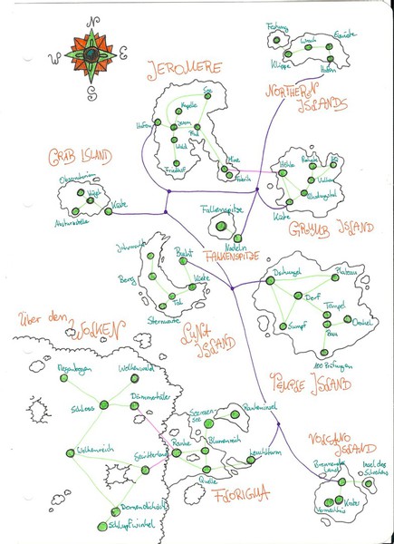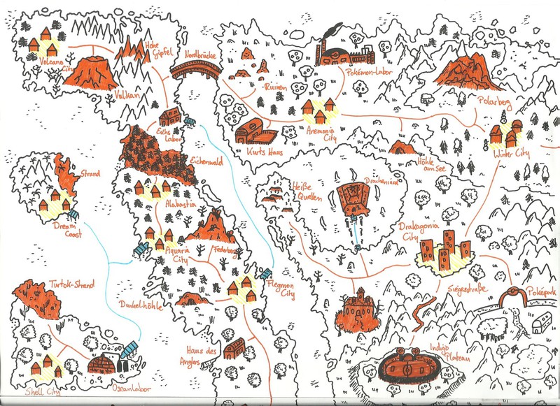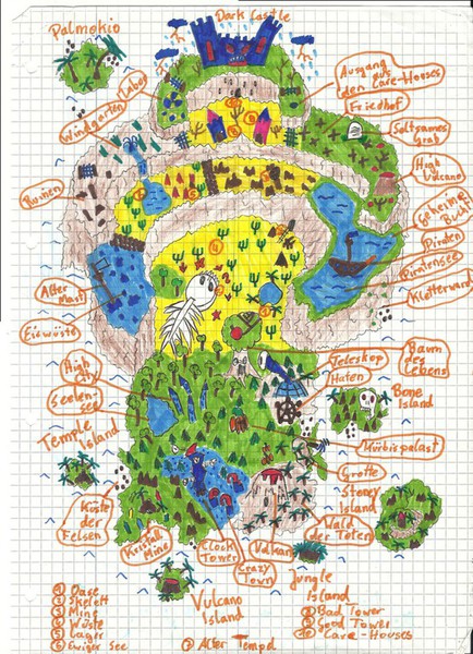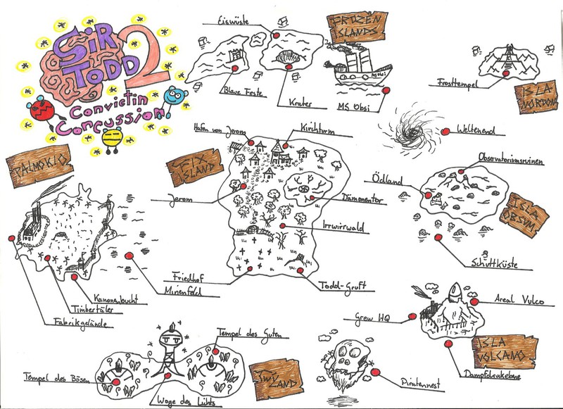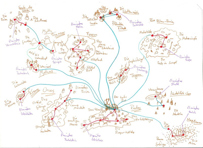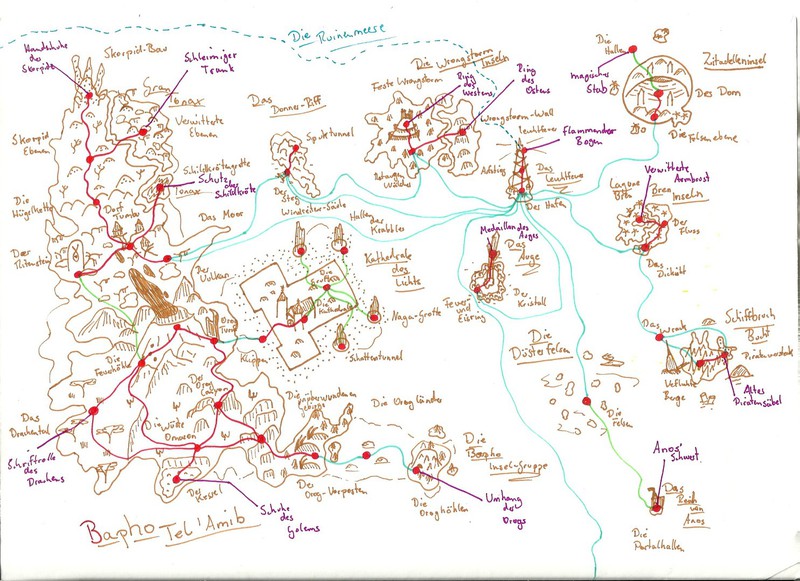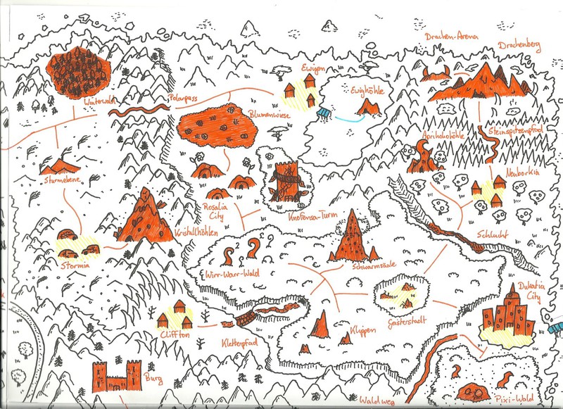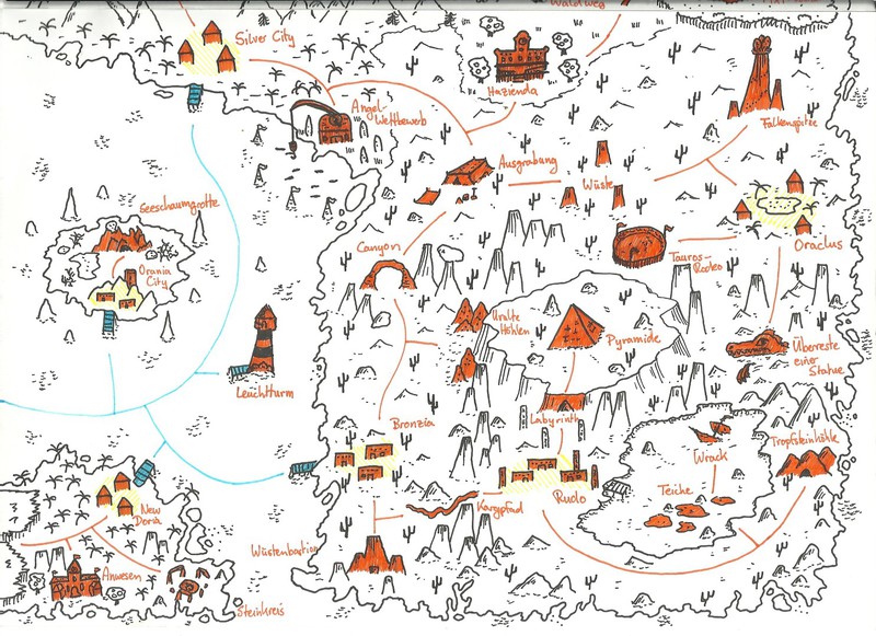 Hier habe ich einmal einige meiner Karten und Pläne bezüglich des Leveldesigns gesammelt. Es handelt sich hierbei um Konzepte sowohl für PC- als auch Brettspiele. Anhand dieser Karten entwerfe ich dann meist Kreaturen und Gebäude, die auf den jeweiligen Bereich abgestimmt sind. Aus vielen dieser Karten habe ich Orte übernommen und in "Equilibrium" verarbeitet, daher könnte man dies auch unweigerlich als "Ideensammlung" beschreiben. Eine Digitalisierung der Karten steht bisher noch aus, allerdings werde ich das in naher Zukunft mit Hilfe des Programms "Cartographer" umsetzen.