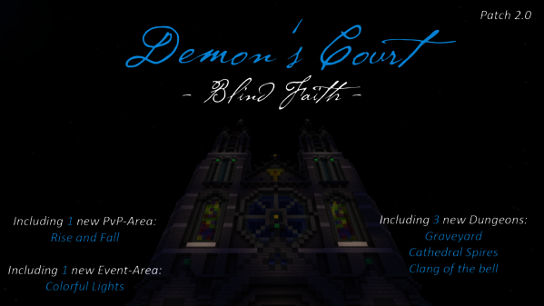 Mit „Demon‘s Court - Blind Faith“ (Patch 2.0) verwandelt sich das allseits beliebte Herzstück der Stadt „Wellshire Cathedral“ in den gefürchteten „Demon‘s Court“. Etwas Unheimliches und zugleich unbeschreiblich Boshaftes treibt sein Unwesen in den Türmen der Kathedrale. Durchstreift mit vier Freunden den „Graveyard“ und kämpft euch durch die heraufbeschworenen Wiedergänger, die das weitläufige Friedhofsgelände unsicher machen. Doch verlauft euch nicht, denn bei näherer Betrachtung wirkt der Friedhof wie ein magisches Labyrinth, das jeden Besucher verschlingt und so schnell nicht wieder freigibt. Um jedoch die Kathedrale betreten zu können, müsst ihr euch zunächst durch das angrenzende „Dean‘s Residence“ prügeln. Die verfluchten Pforten des Pfarrhauses halten grausame Monstrositäten innerhalb der Mauern, doch sie schützen zugleich die dämonische Präsenz innerhalb der Kathedrale. Findet einen Weg in den „Demon‘s Court“, denn dort erwartet euch der Erzdämon, der nun Besitz von dem einst heiligen Platz ergriffen hat. Befreit „Wellshire Cathedral“ von den Dämonen und rettet die Stadt vor der hereinbrechenden Flut Untoter. – Ebenso wird ein neuer PvP-Bereich eröffnet: „The Crypt“. Die große Krypta inmitten des Friedhofgeländes ist ein verwinkeltes und gefährliches Areal voller Fallen und furchterregender Gestalten. Liefert euch ein Gefecht der Extraklasse, doch hütet euch vor den untoten Horden, die auch dieses Gebiet unsicher machen. – Außerdem wird der erste Event-Bereich von „The City“ eröffnet. „Rise and Fall“ beinhaltet großartige Herausforderungen für mutige und geschickte Abenteurer, die die Turmspitze erreichen wollen. Macht euch auf eine Jump‘n‘Run-Herausforderung gefasst, die sich (mit Weihwasser) gewaschen hat!