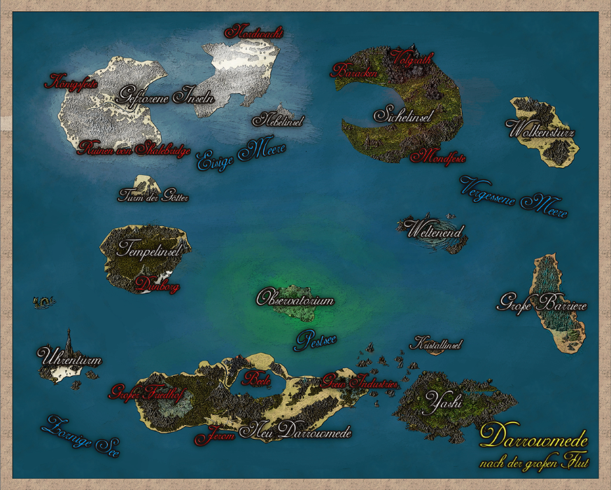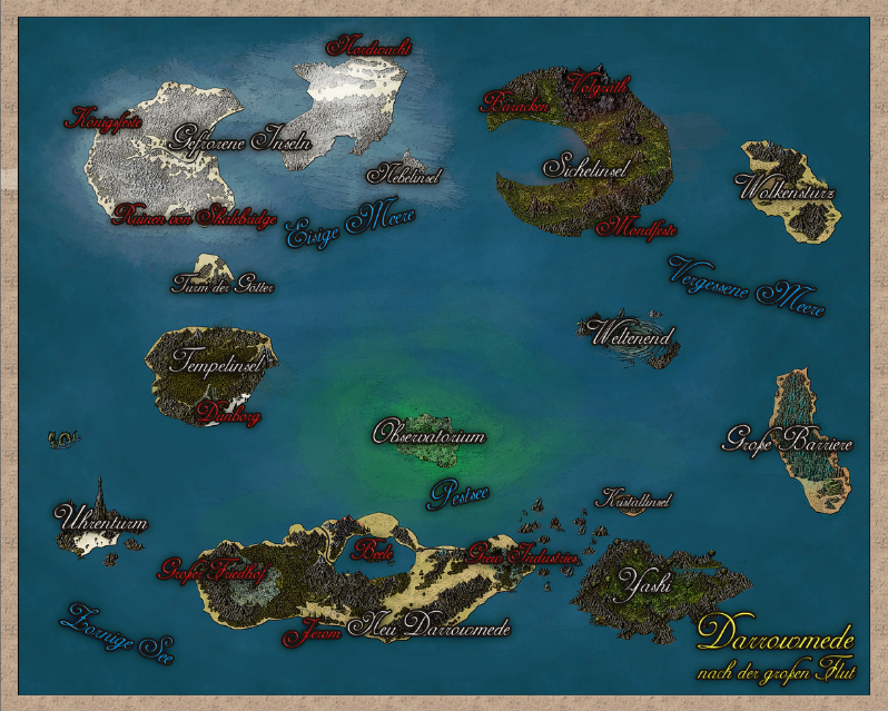 Die unten abgebildete Karte zeigt das Königreich Darrowmede nach der großen Flut des hohen Drachen Malygris. Wohingegen die Rückblicke im Prolog und Epilog von Equilibrium vor der großen Flut spielen, findet das Hauptgeschehen des ersten Kapitels der Green Moon-Trilogie auf dieser Karte statt. Dennoch finden sich einige Orte aus dem Rollenspiel-Universum auch auf dieser Karte wieder, auch wenn sie jetzt andere Namen tragen.