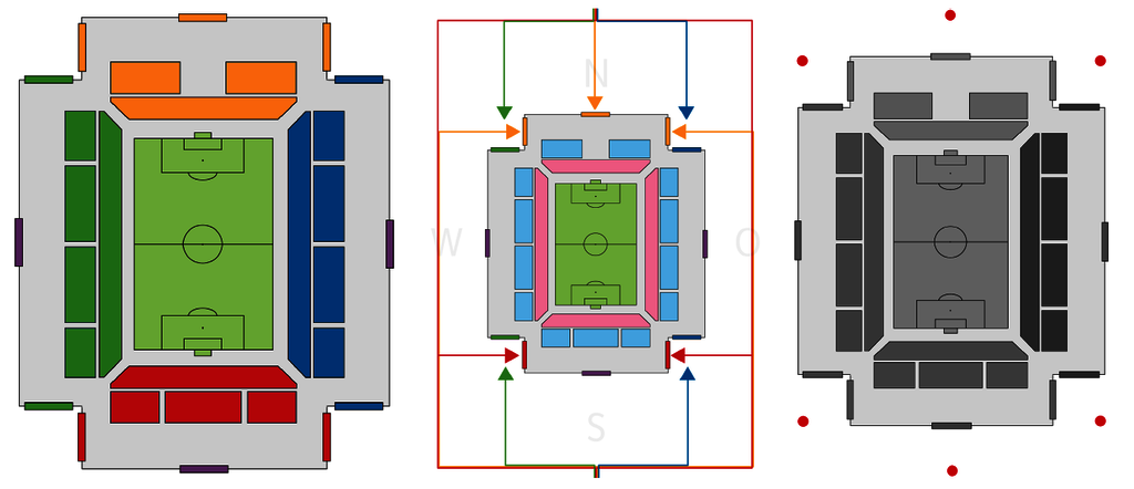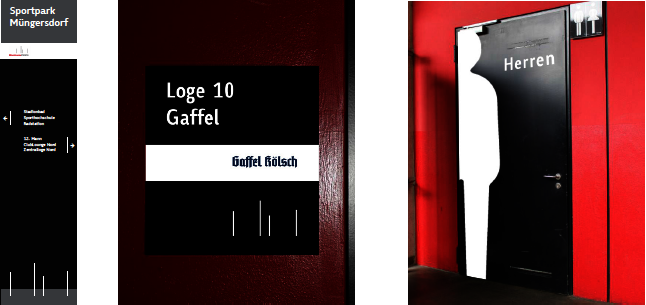 Zu dem fertigen Leitsystem gehört natürlich auch die damit in Verbindung stehende Gestaltung der Eintrittskarten, die nun auf das Farbsystem und die neuen Bezeichnungen der Tribünenabschnitte zugeschnitten wurde sowie die Gestaltung von Türschildern und Stelen für den Außenbereich.