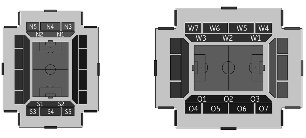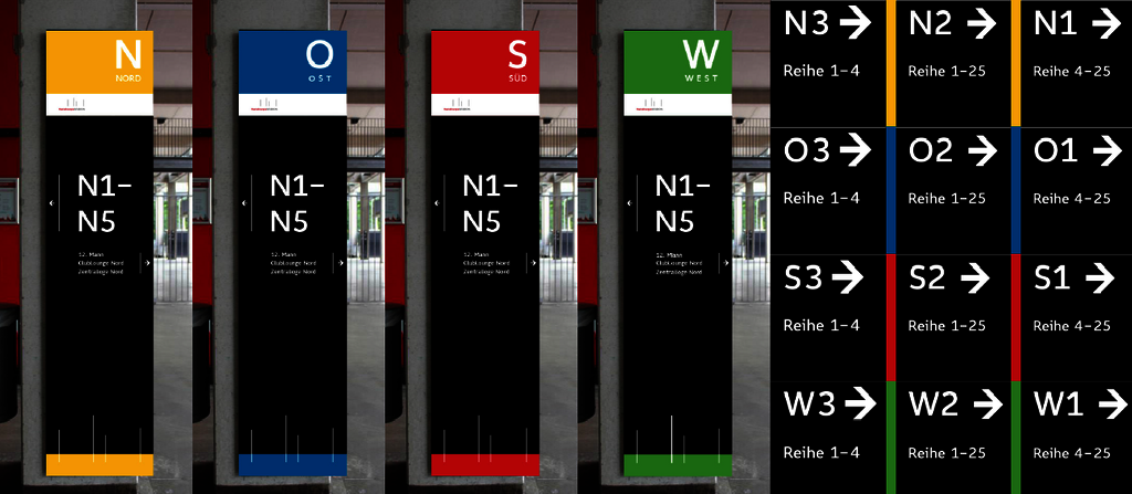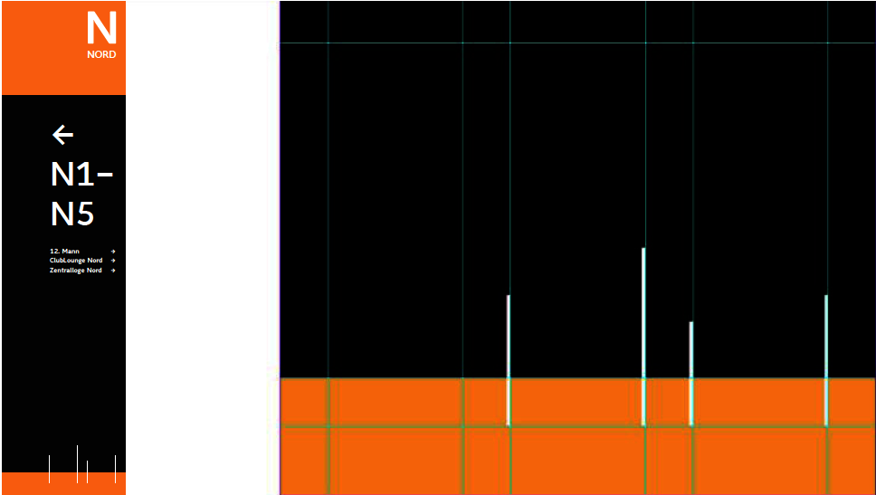 Das Raster der Stelen basiert auf dem neuen Logo des Stadions. An diesem Raster wurden alle anderen Gestaltungen orientiert und angeordnet. Um eine gute Lesbarkeit auf Distanz zu gewähren, wird bei dem neuen Leitsystem die Wayfinding Sans genutzt, welche für die Anwendung bei Leitsystemen konzipiert und entwickelt wurde.