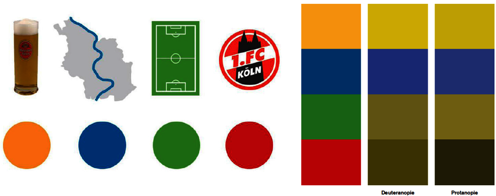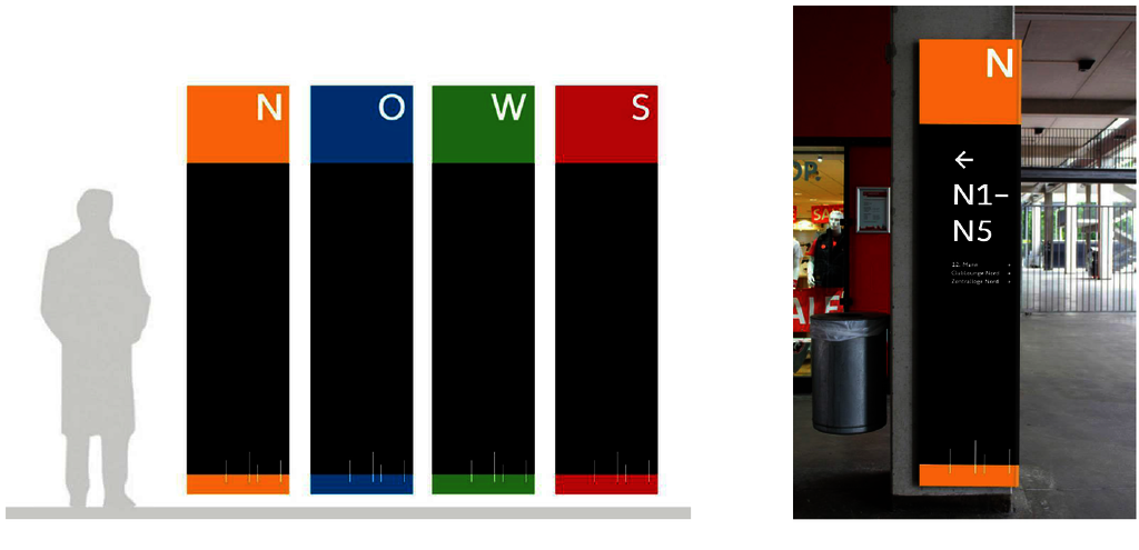 Nun musste ein Raster für die Stelen und Infotafeln sowie ein Farbcodierungssystem entworfen werden, welche das Stadion übersichtlicher und verständlicher gestalten. Hierbei mussten die nun angewandten Farben einer Überprüfung auf die Unterscheidbarkeit bei möglichen Farbblindheiten unterzogen werden. Der dargestellte Farbtest zeigt die Farbdarstellung bei einer Deuteranopie sowie bei einer Protanopie. Dabei handelt es sich um die zwei am häufigsten auftretenden Farbblindheiten.